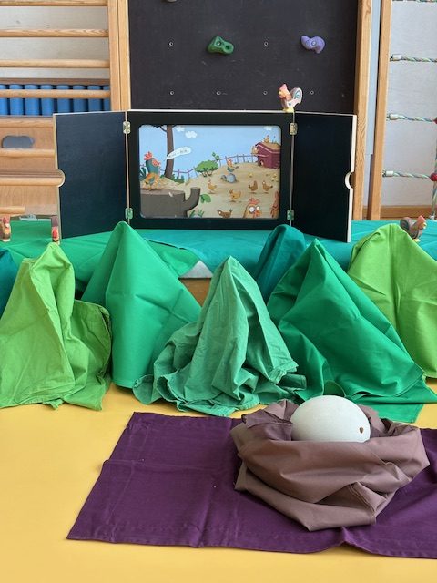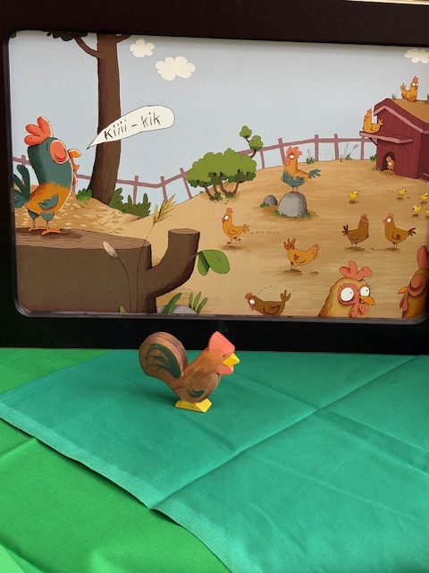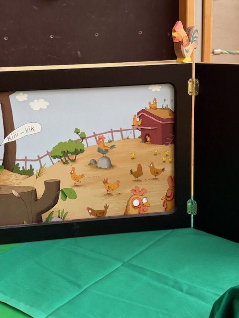 Birgit hat den Kindergarten und Krippenkinder „Heinrich will brüten“ mit dem Kamishibai erzählt. Die Geschichte vom kleinen Hahn Heinrich, der auch einmal ein Ei ausbrüten möchte und damit für ordentlich Verwirrung auf dem Hühnerhof sorgt, hat allen richtig gefallen.